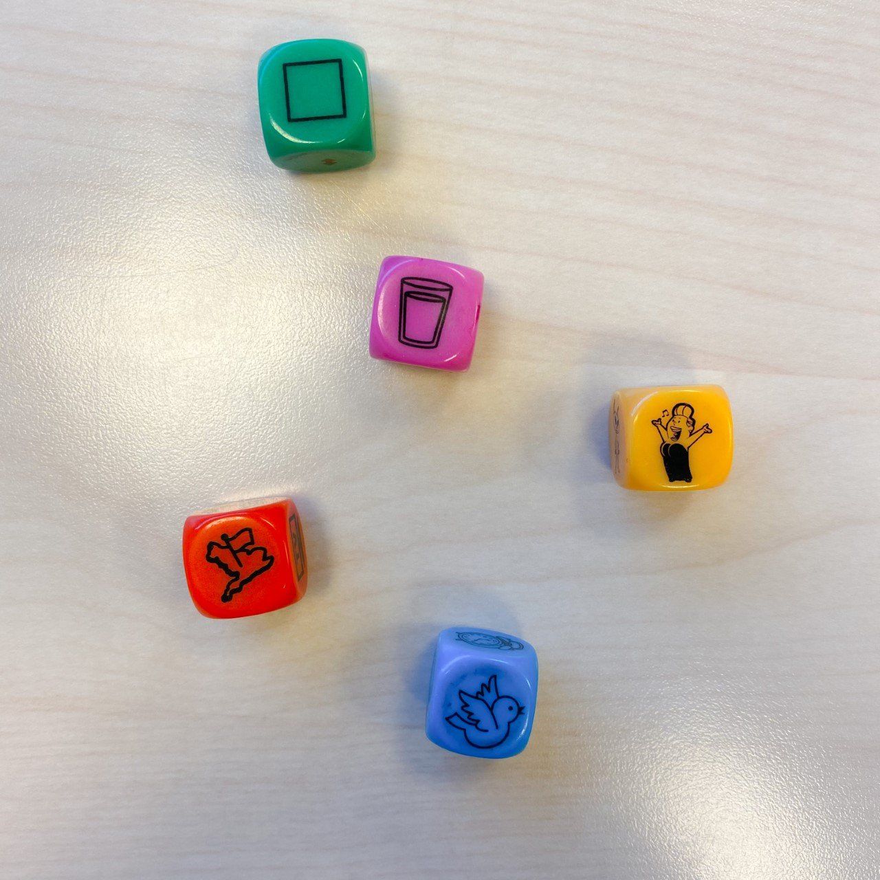 Er zijn vijf dobbelstenen met letters en vijf dobbelstenen met thema's. De dobbelstenen met de thema's worden als eerst gegooid, de thema's worden hardop uitgesproken. Voorbeelden van thema's zijn : een tv-programma, een stad, iets ronds, iets kleins, een beroep, een mannelijke voornaam, een vogel, een voorwerp, een gerecht, een spel, enz. Als de thema's zijn gezegd, dan worden de letter dobbelstenen gegooid. Wie als eerste een woord bedenkt dat begint met één van de vijf letters én één van de gegooide thema's past, heeft de twee dobbelstenen verdiend. Je gaat net zo lang door totdat de dobbelstenen op zijn. Leuke twist : twee dezelfde kleuren mogen niet met elkaar gecombineerd worden. Je verdient een punt per combinatie, degene die als eerst bij de vooraf afgesproken punten is wint het spel!